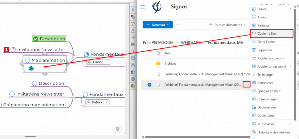 L’ajout et la gestion de liens issus de Microsoft SharePoint ou Teams deviennent un jeu d’enfant. La commande « Copier le lien » fonctionne maintenant parfaitement avec les cartes stockées dans les bibliothèques cloud. En un clic, vous collez votre lien dans MindManager et ouvrez la carte cible directement depuis son emplacement en ligne. Un vrai gain de temps pour les équipes connectées.