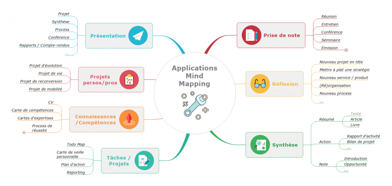 Le Mind Mapping est une méthode visuelle d’organisation hiérarchique des idées. Cette méthode est utilisée pour réfléchir, projeter les idées sur un schéma, prendre du recul, pouvoir les structurer et les évaluer.