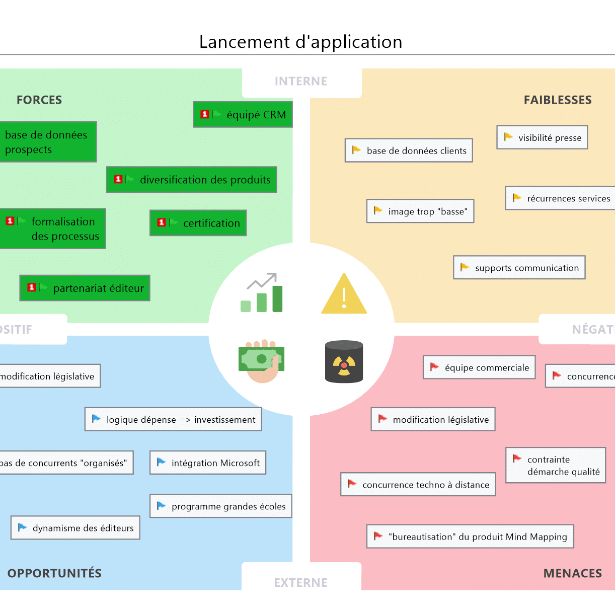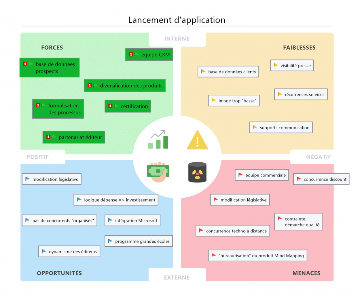 Notez bien que toutes les fonctions qui font la puissance de MindManager, tels les marqueurs, les filtres, les hyperliens, les pièces-jointes, les zones notes et bien d’autres encore, sont disponibles dans tous les diagrammes !