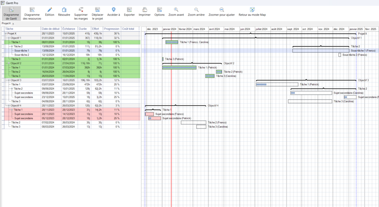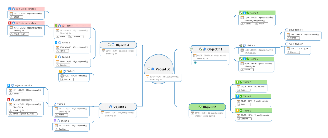Un des modes les plus demandés et le plus aboutis sur MindManager. Il reproduit sous forme de ligne de temps toutes les tâches avec leur avancement, leurs ressources et leurs interdépendances.