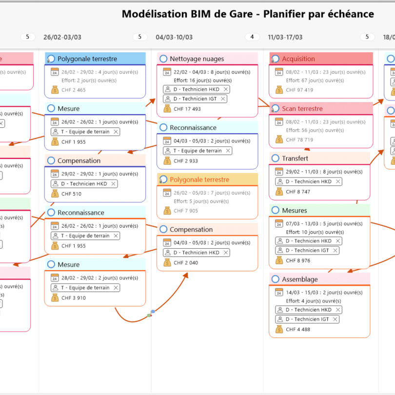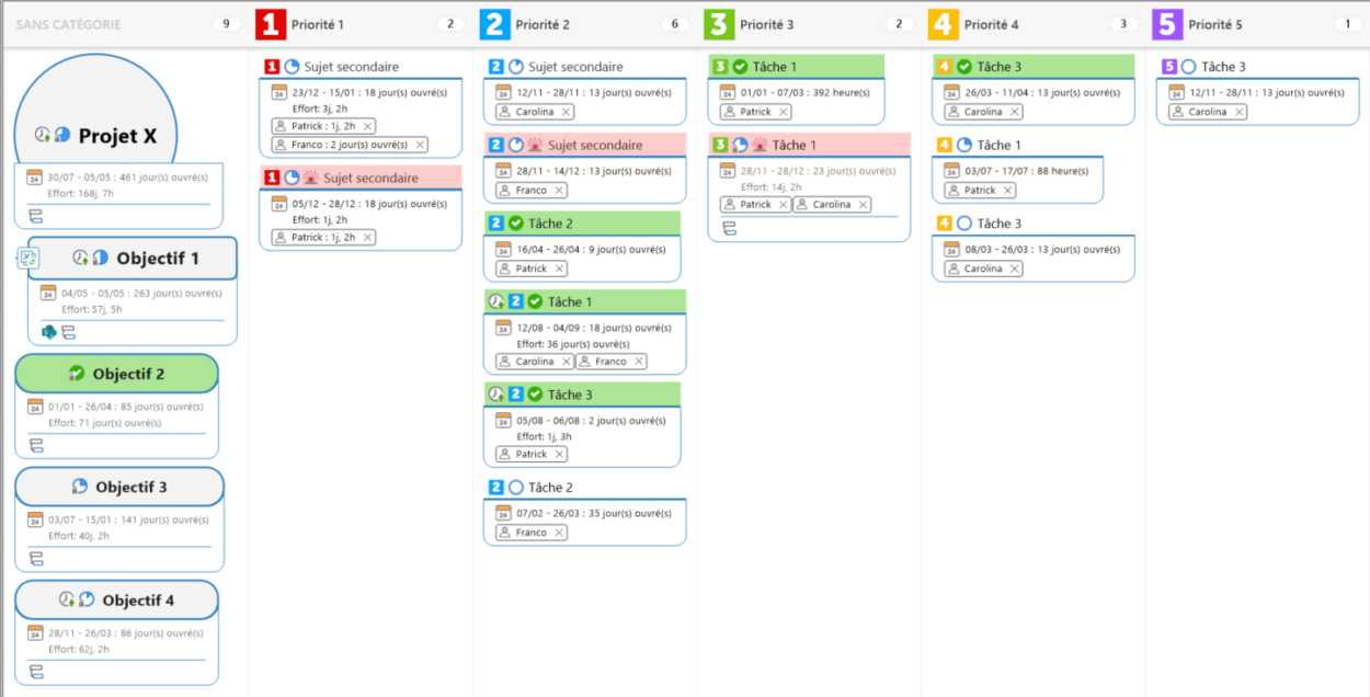 Programmation, Kanban et Gantt sont des modes d’affichage et ne sont liés à aucun module. Ils peuvent être déclenchés depuis n’importe quel type de schéma. Ceux-ci sont créés grâce aux éléments d’Index de map (balises ou icônes) et les Infos de Tâches (dates, priorités, avancement, etc…)