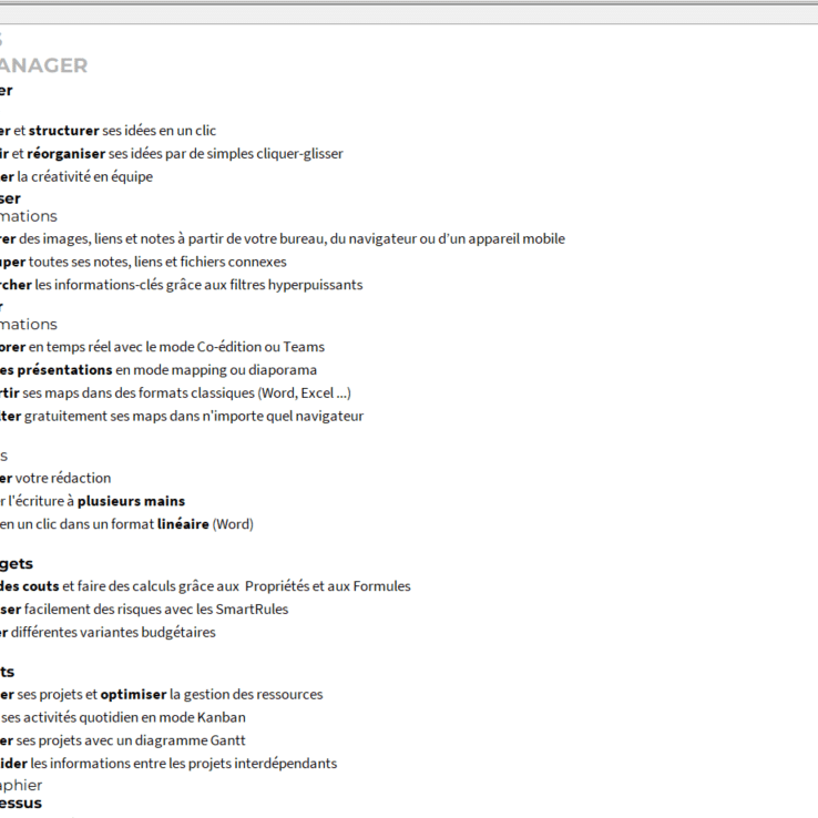 MindManager est aujourd’hui une solution complète de Management Visuel. Vous allez pouvoir créer toute sorte de visuels.