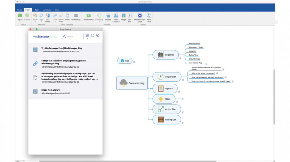 Recueillez du contenu à tout moment et ajoutez-le à votre file d’attente pour une utilisation ultérieure avec MindManager Snap