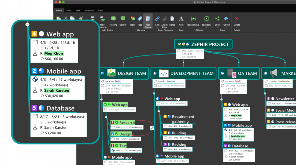 • Déplacez les projets, supprimez les marges, consolidez les tâches, affichez les chemins critiques, définissez des dates importantes et plus encore.