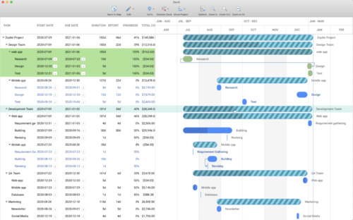 Les diagrammes de Gantt fournit aux gestionnaires de projet des détails et une visibilité sur les éléments essentiels et l’état d’avancement des projets. Suivez et ajustez les coûts généraux du projet, les dates de début, les dates d’échéance, les ressources, etc.
