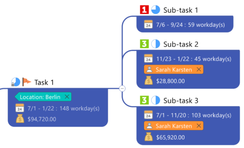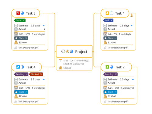 Grâce à MindManager, vous pouvez attribuer des dates, des échéances et des priorités à vos tâches. Celles-ci se matérialisent visuellement et permettent par la suite de générer des vues Kanban ou Gantt.