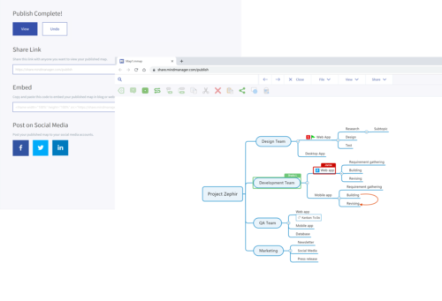 Publiez et partagez vos maps avez des collègues et clients, y compris ceux qui n’ont pas MindManager. Chaque map publiée est associée à un lien Web dynamique qui peut être actualisé à tout moment et utilisé via un navigateur Web.