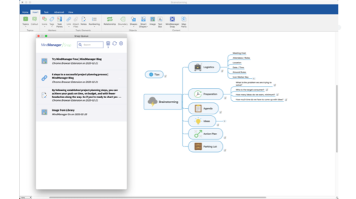 Avec MindManager Snap, vous pouvez capturer les idées ou le contenu en temps réel. Il vous suffit de vous l’envoyer à vous ou aux membres de votre équipe et il vous attendra dans les files d’attente Snap appropriées la prochaine fois que vous ouvrirez MindManager.