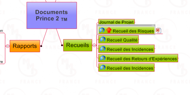 Cette map vous montre comment accéder à partir d’une seule page à tous les documents concernant la gestion d’un projet, y compris le plan initial et le suivi que vous pourrez par exemple visualiser dans MindManager ou JCVGantt.